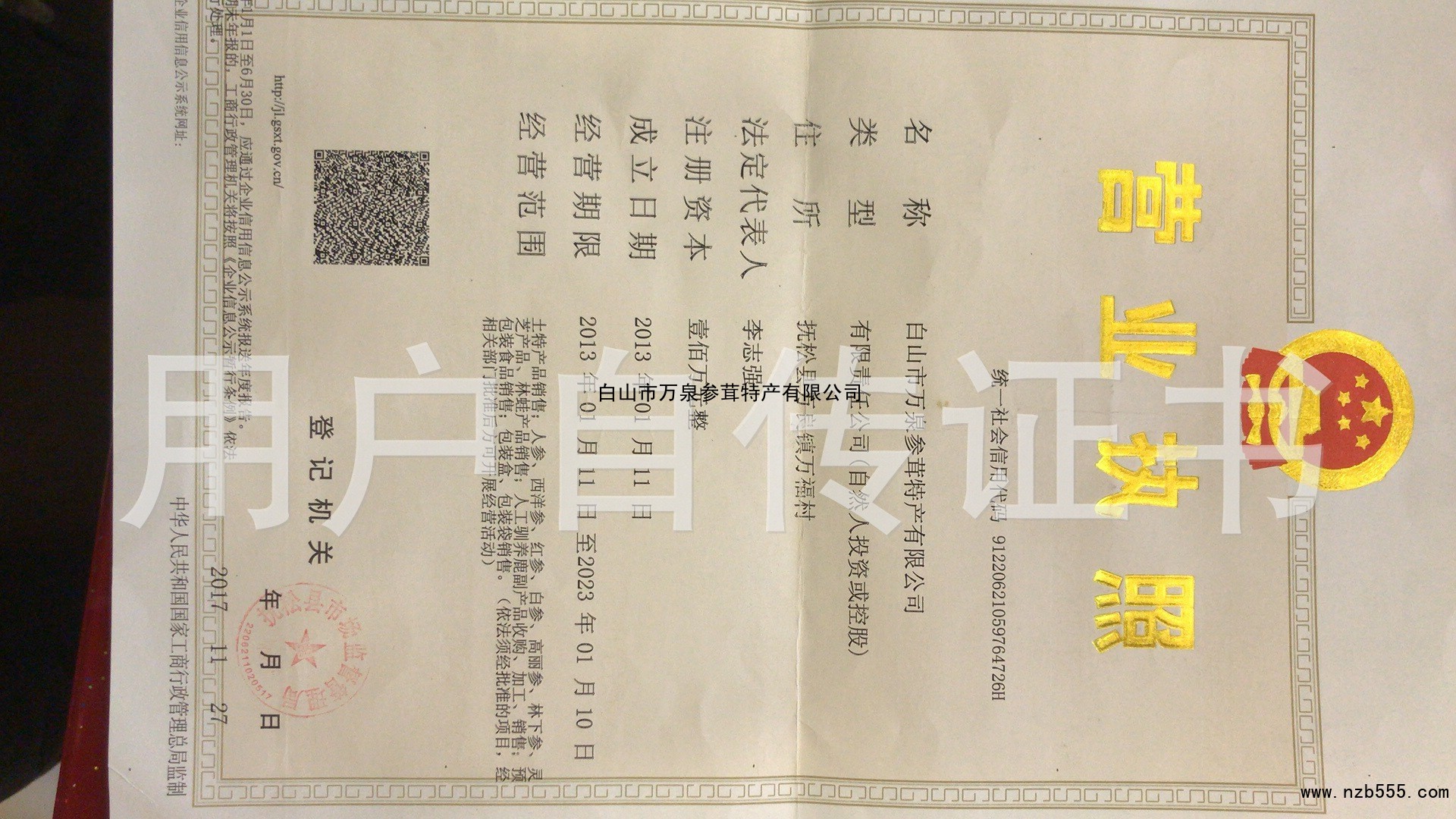 | 發(fā)證機(jī)構(gòu): | 撫松縣市場監(jiān)督管理局 | 發(fā)證時(shí)間 : | 2017-11-27 |