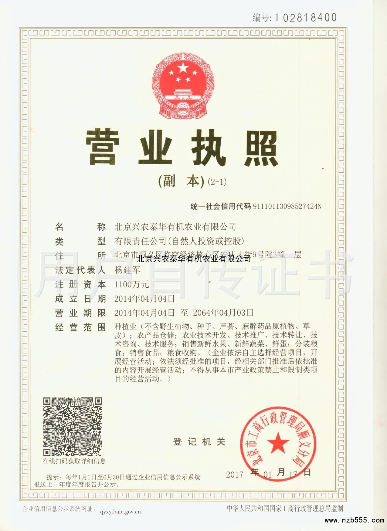 | 發(fā)證機(jī)構(gòu): | 北京市工商行政管理局順義分局 | 發(fā)證時(shí)間 : | 2017-01-17 |