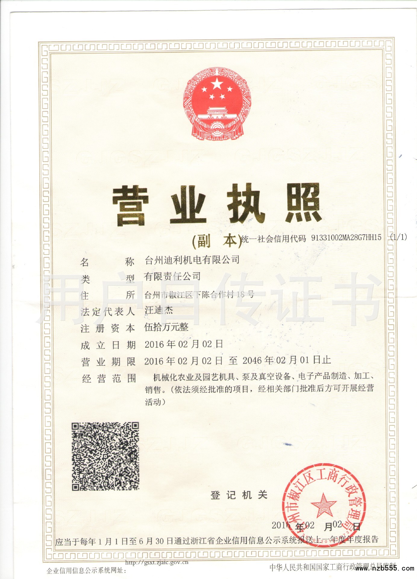 | 發(fā)證機(jī)構(gòu): | 臺(tái)州市椒江區(qū)工商行政管理局 | 發(fā)證時(shí)間 : | 2016-02-02 |