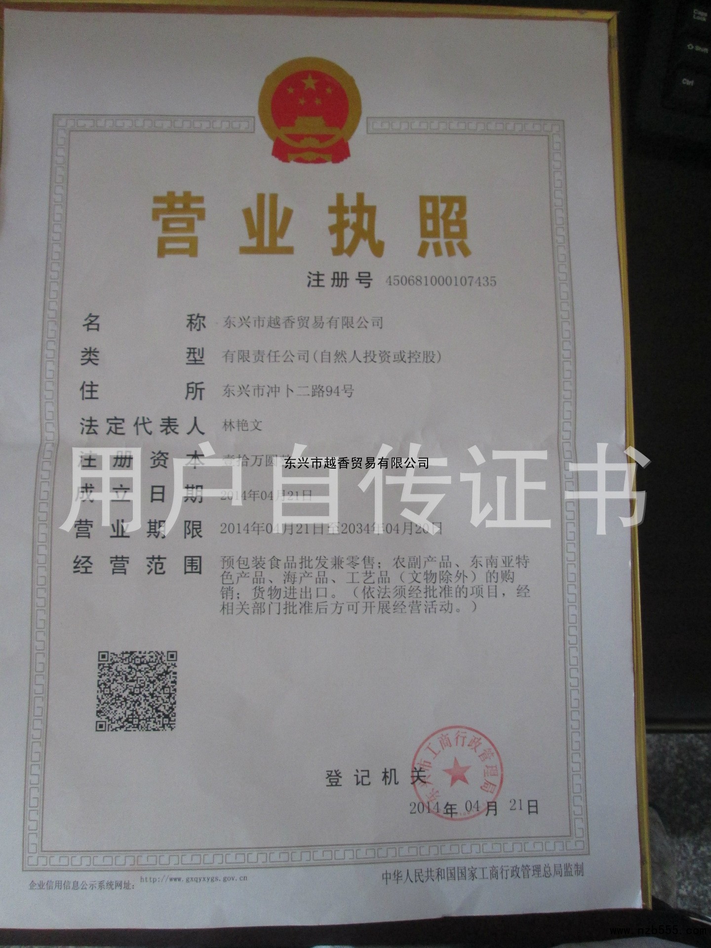| 發(fā)證機(jī)構(gòu): | 東興市工商行政管理局 | 發(fā)證時(shí)間 : | 2014-04-21 |