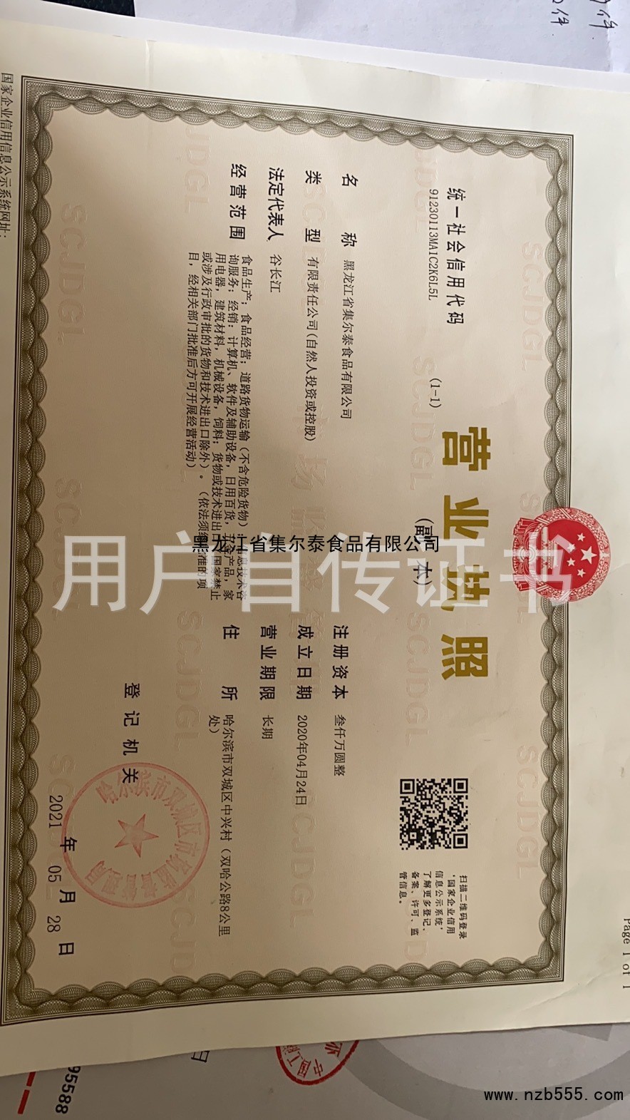| 發(fā)證機(jī)構(gòu): | 哈爾濱市雙城區(qū)市場監(jiān)督管理局 | 發(fā)證時間 : | 2021-05-28 |