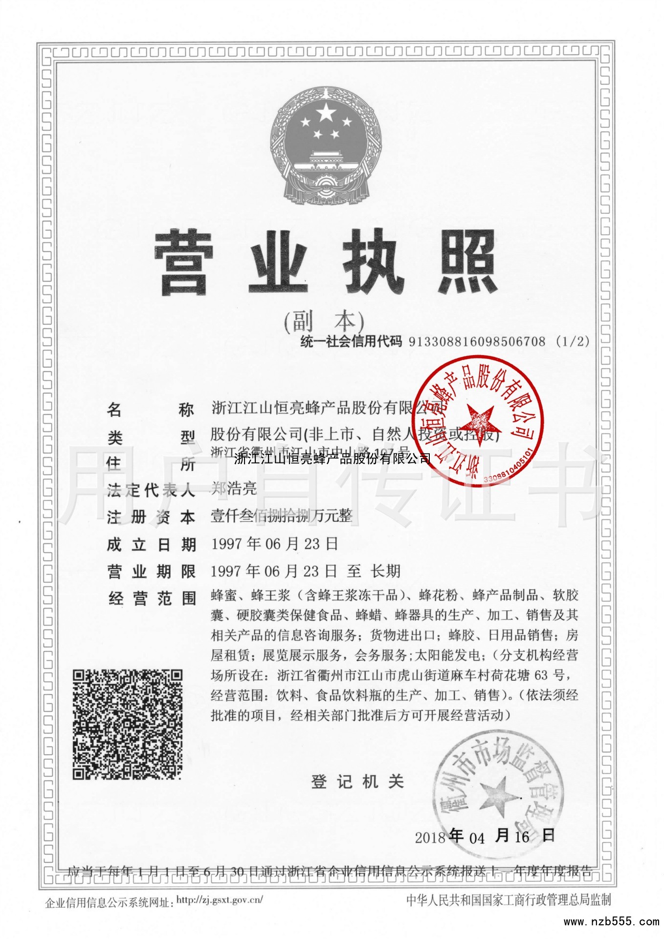 | 發(fā)證機(jī)構(gòu): | 衢州市市場(chǎng)監(jiān)督管理局 | 發(fā)證時(shí)間 : | 2018-04-16 |