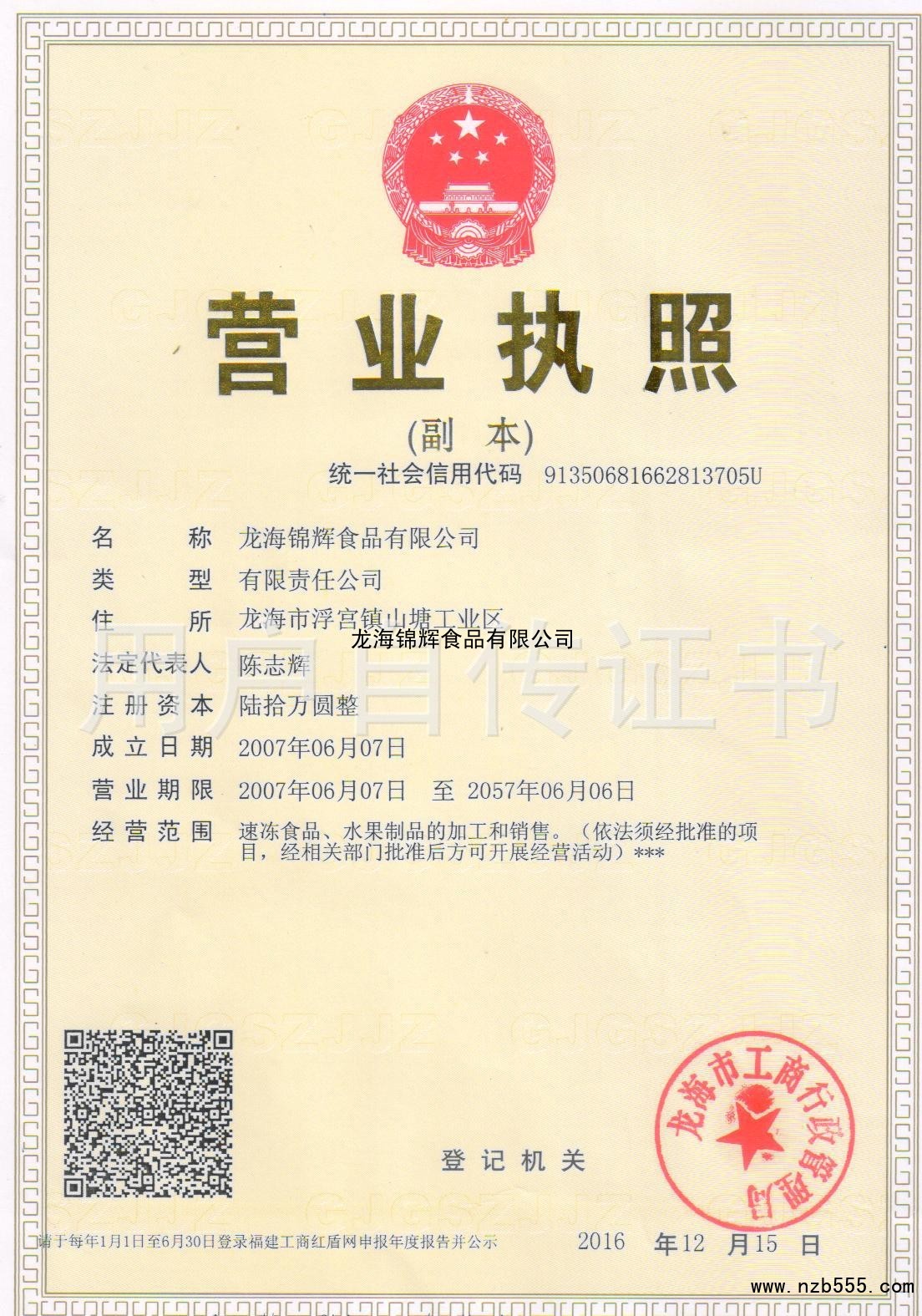 | 發(fā)證機(jī)構(gòu): | 龍海市工商行政管理局 | 發(fā)證時(shí)間 : | 2016-12-15 |