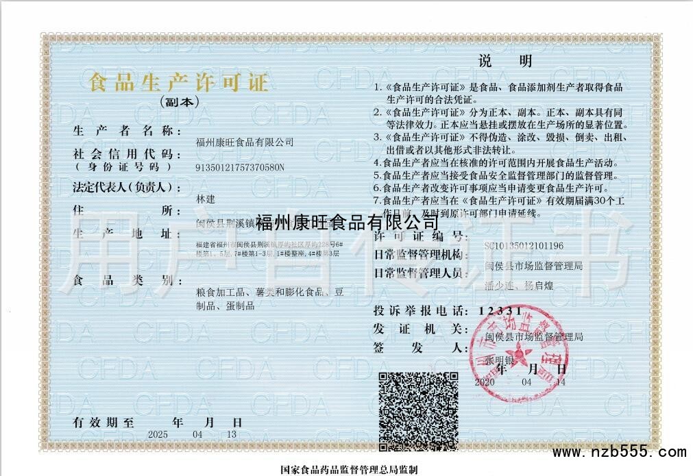 食品生產許可證(除乳制品、嬰幼兒配方乳粉、酒之外的生產許可證)