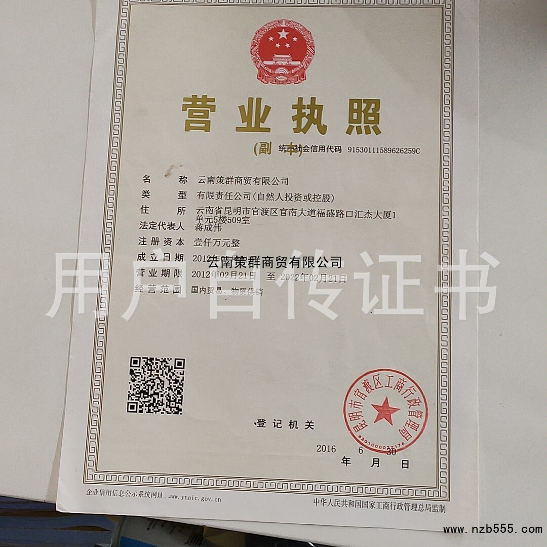 | 發(fā)證機(jī)構(gòu): | 昆明市官渡區(qū)工商行政管理局 | 發(fā)證時(shí)間 : | 2016-06-30 |