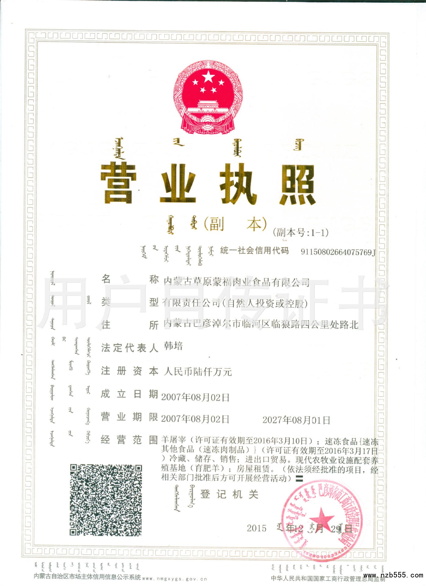 | 發(fā)證機(jī)構(gòu): | 巴彥淖爾市工商行政管理局臨河分局 | 發(fā)證時(shí)間 : | 2015-12-29 |