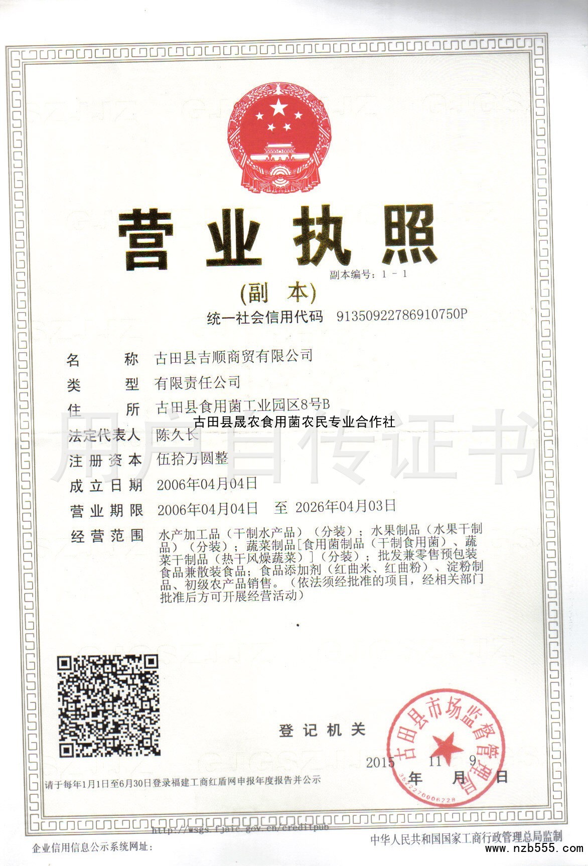 | 發(fā)證機(jī)構(gòu): | 古田縣市場(chǎng)監(jiān)督管理局 | 發(fā)證時(shí)間 : | 2015-11-09 |