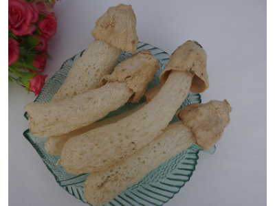 二、將干竹蓀50g用溫水泡10分鐘、洗凈,把切成很碎并加有鹽和味精的細豬肉放入竹蓀的空心中,一條條擺好,蒸25分鐘后,等50℃時切成方塊即可食用。