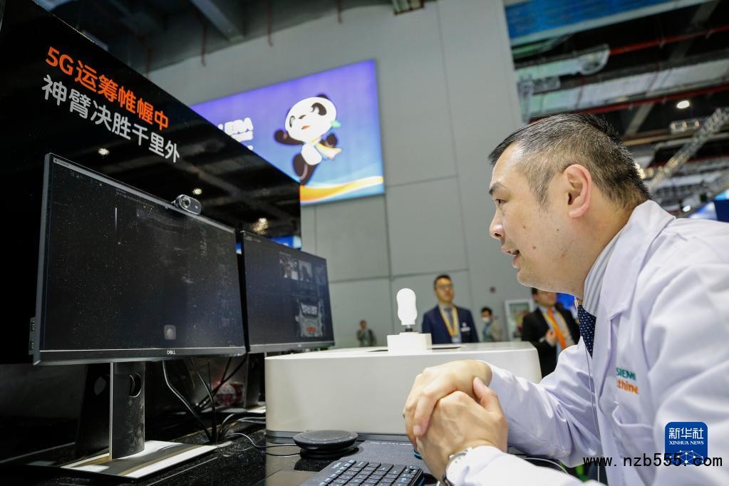一位超聲科醫(yī)生在第二屆中國(guó)國(guó)際進(jìn)口博覽會(huì)上使用西門(mén)子5G醫(yī)療遠(yuǎn)程超聲解決方案,與重慶市彭水苗族土家族自治縣紹慶街道社區(qū)衛(wèi)生服務(wù)中心?的超聲醫(yī)生進(jìn)行遠(yuǎn)程實(shí)時(shí)高清超聲圖像傳輸和音視頻對(duì)話(2019年11月6日攝)。新華社記者 張玉薇 攝