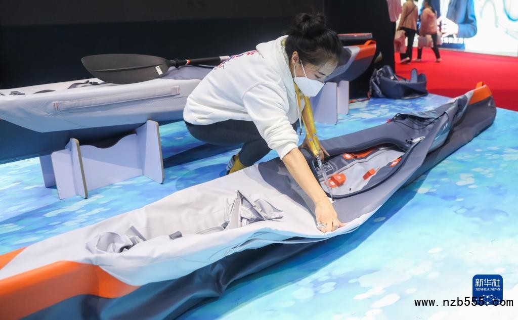 工作人員在第三屆中國(guó)國(guó)際進(jìn)口博覽會(huì)消費(fèi)品展區(qū)的迪卡儂展臺(tái)演示可折疊皮劃艇如何安裝(2020年11月6日攝)。新華社記者 丁汀 攝